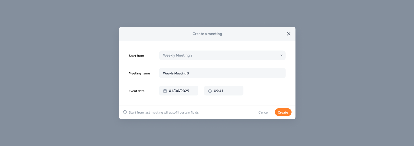 To get started, create a meeting by giving it a title and a date. If you want to save time, you can set up a new meeting based on an existing one so you keep its structure and properties.